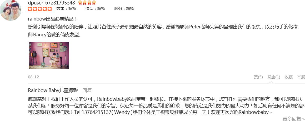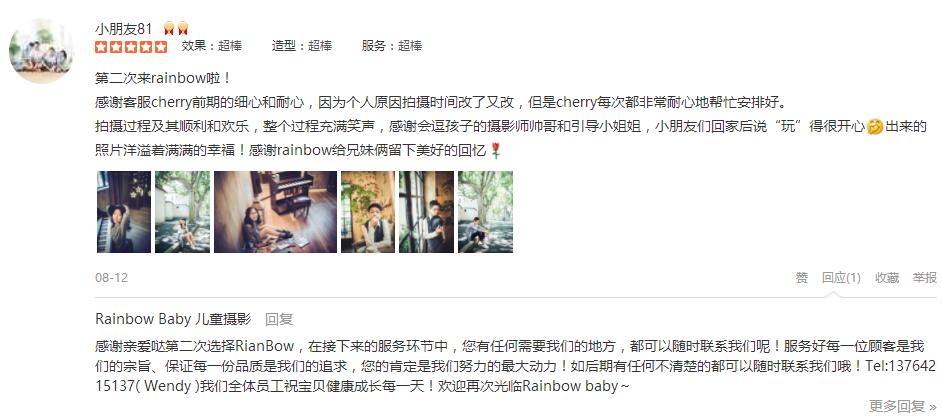 第二次来rainbow啦! 感谢客服cherry前期的细心和耐心,因为个人原因拍摄时间改了又改,但是cherry每次都非常耐心地帮忙安排好。 拍摄过程及其顺利和欢乐,整个过程充满笑声,感谢会逗孩子的摄影师帅哥和引导小姐姐,小朋...