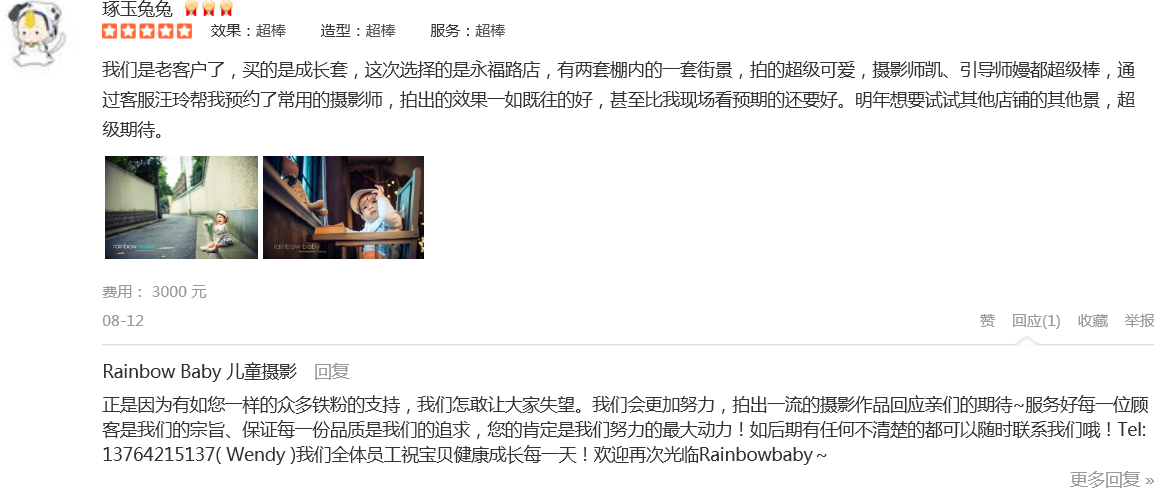 我们是老客户了,买的是成长套,这次选择的是永福路店,有两套棚内的一套街景,拍的超级可爱,摄影师凯、引导师嫚都超级棒,通过客服汪玲帮我预约了常用的摄影师,拍出的效果一如既往的好,甚至比我现场看预期的还要好。明年想...