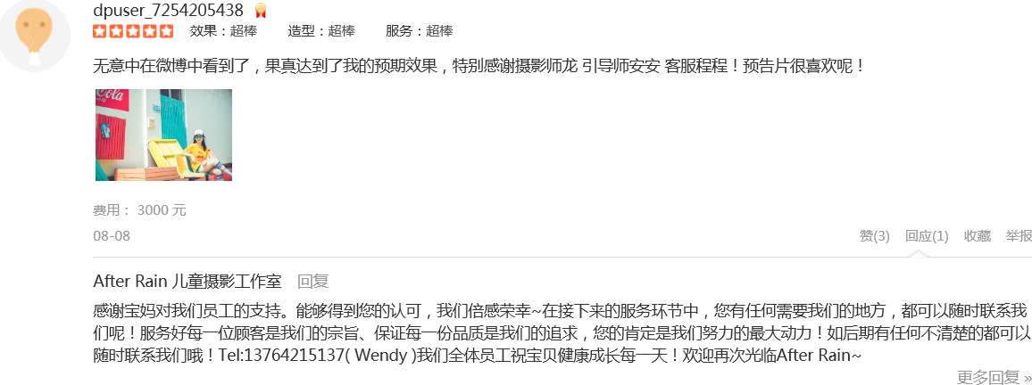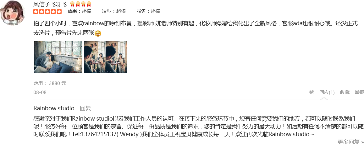 一次超棒的体验!好友介绍的这家,摄影师唐总监人很nice,长的又帅色摄影技术更是没话说强强强引导师思思性格超好!态度也好强还有化妆师……等等也都好好好呲牙第一张我的最爱好喜欢色色色最后还要谢谢温柔可爱的客服美丽...