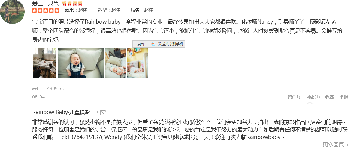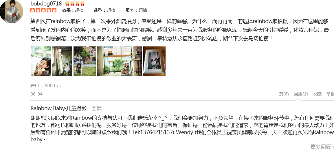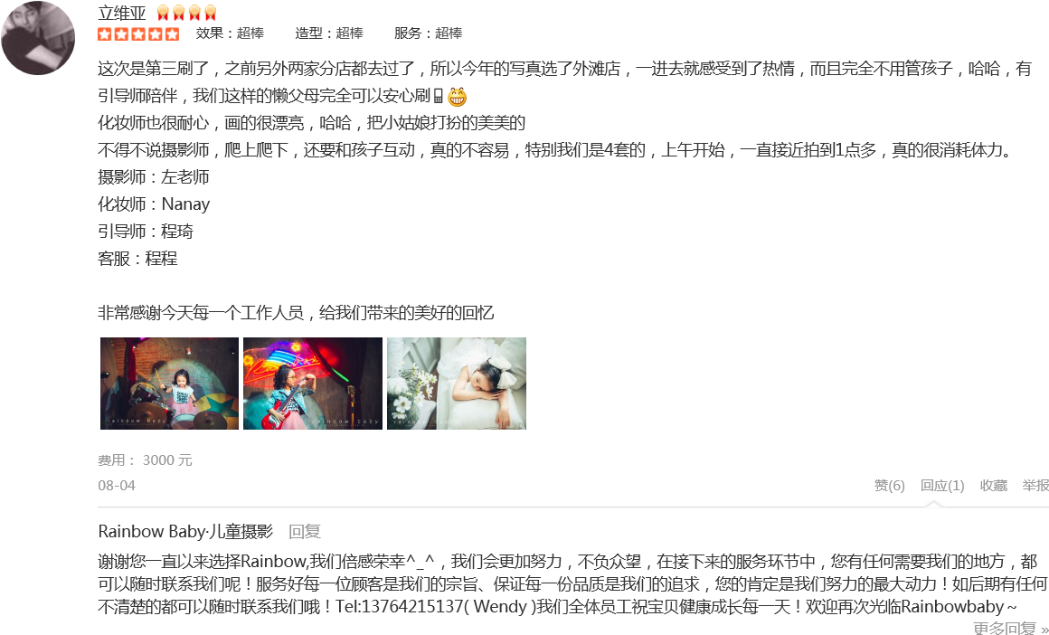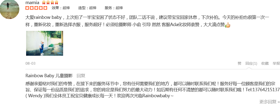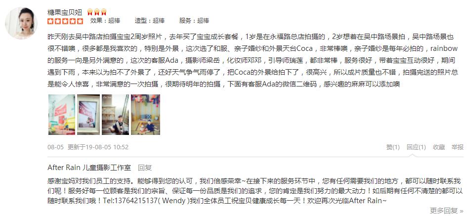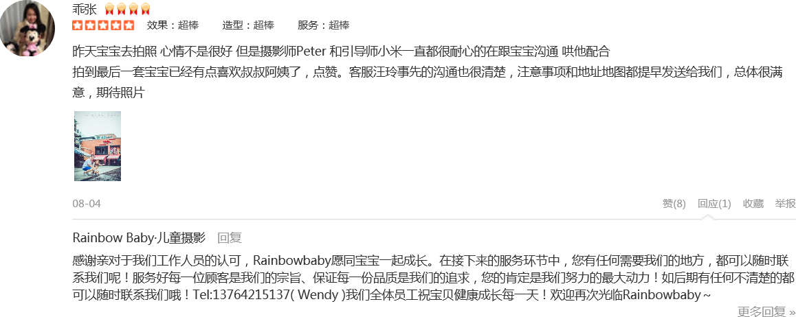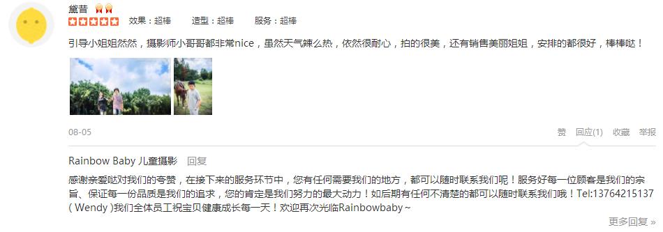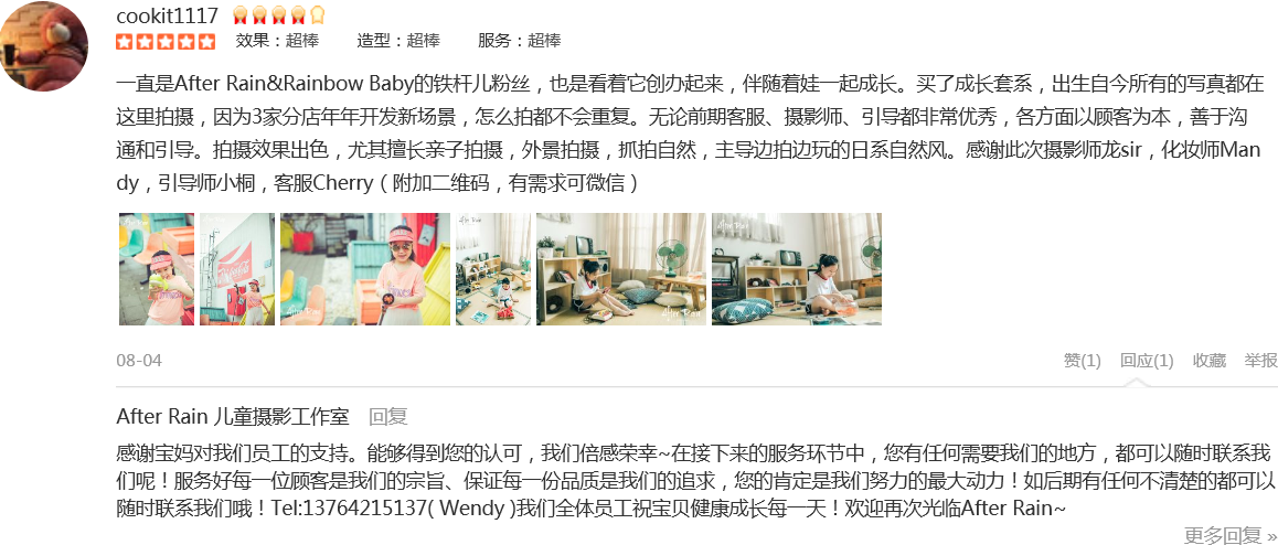 一直是After Rain&Rainbow Baby的铁杆儿粉丝,也是看着它创办起来,伴随着娃一起成长。买了成长套系,出生自今所有的写真都在这里拍摄,因为3家分店年年开发新场景,怎么拍都不会重复。无论前期客服、摄影师、引导都非常优秀,...