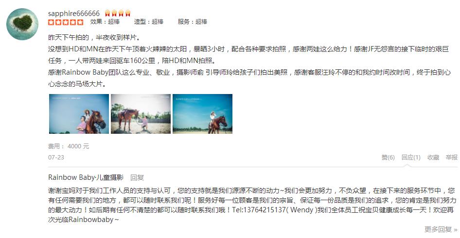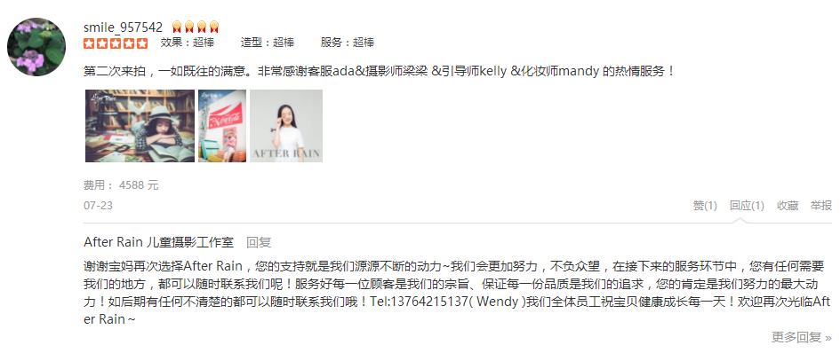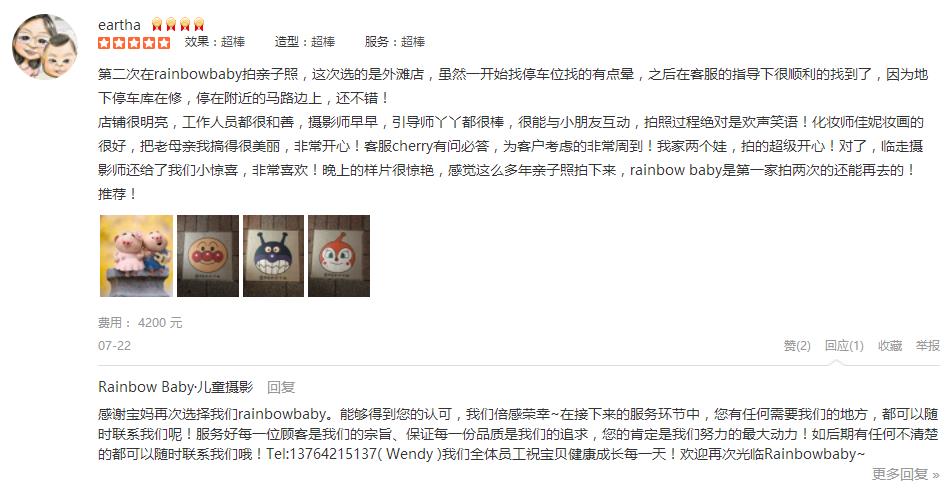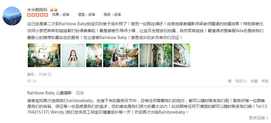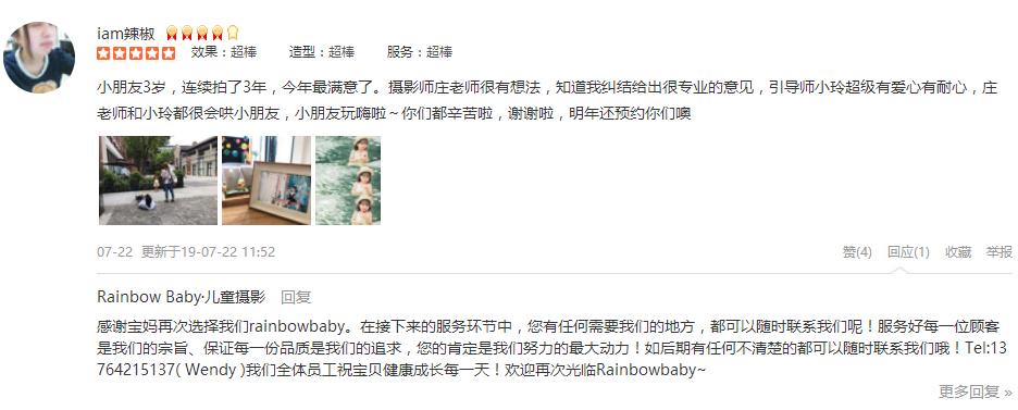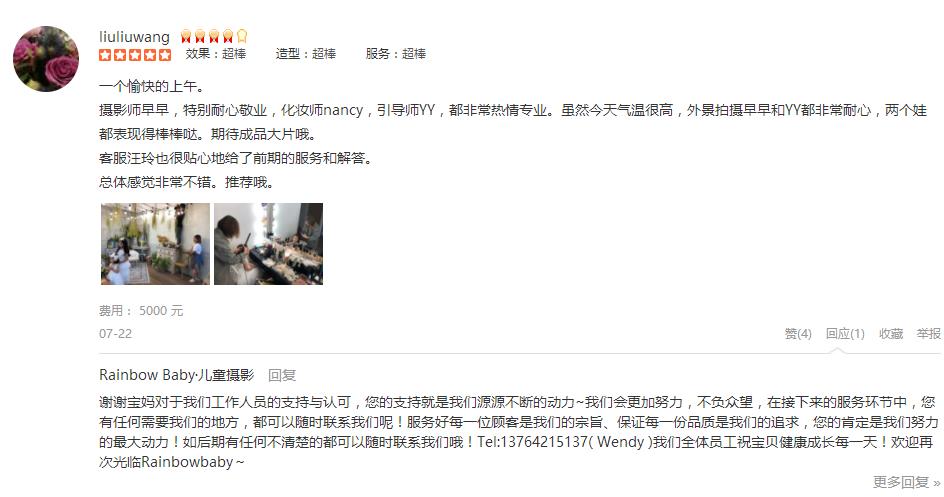 一个愉快的上午。 摄影师早早,特别耐心敬业,化妆师nancy,引导师YY,都非常热情专业。虽然今天气温很高,外景拍摄早早和YY都非常耐心,两个娃都表现得棒棒哒。期待成品大片哦。 客服汪玲也很贴心地给了前期的服务和解答。 ...