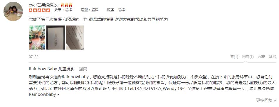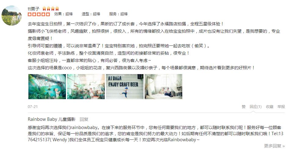 去年宝宝生日拍照,第一次结识了rb,果断的订了成长套,今年选择了永福路店拍摄,全程五星级体验! 摄影师小飞侠杨老师,风趣幽默,拍照很拼,很投入,所有的情绪都投入在给宝宝拍照中,成片也没有让我们失望,是我想要的,专业...